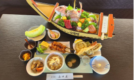 天ぷらはお客様が乗船するときに揚げますので、熱々の天ぷらをご賞味ください(天ぷらは口の中でフンワリ サクサク)。お刺身は、新鮮なものを舟盛りでお出ししています。ご飯は白米・炊き込みご飯とも、ミネラル水で炊いています。